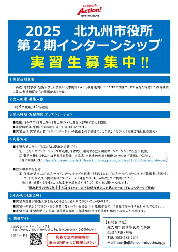 第2期参加希望者は、「北九州市ホームページ」において詳細を確認の上、「北九州市インターンシップ申込書」を作成し、intern@ml.nagasaki-u.ac.jp宛て(タイトルに「北九州市インターンシップ申込」と記入要)にメールで提出するとともに、電子申請システム(外部リンク)へ必要事項の登録をお願いします。