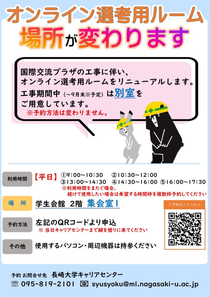【期間限定】オンライン選考用ルームの場所が変わります(~9月末※予定) 2026年03月13日 学生の皆さんへ Tweet Pocket ※クリックすると予約ページへジャンプします※ 国際交流プラザの改修工事に伴って、オンライン選考用ルームの場所が一時的に変わります。(3月下旬~9月末※予定)予約方法は変わりませんので、予約フォームよりご予約をお願いします。