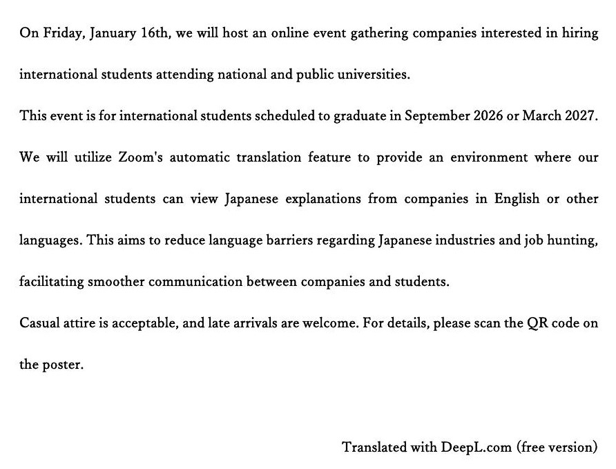 Zoomの自動翻訳機能を活用し、企業様からの日本語の説明を、本学の留学生が英語やその他の言語で視聴できる環境を提供するなど、日本の産業や就職活動に関する言語理解の障壁を減少させ、企業様と留学生間のコミュニケーションを円滑に進める手段となるよう開催いたします。