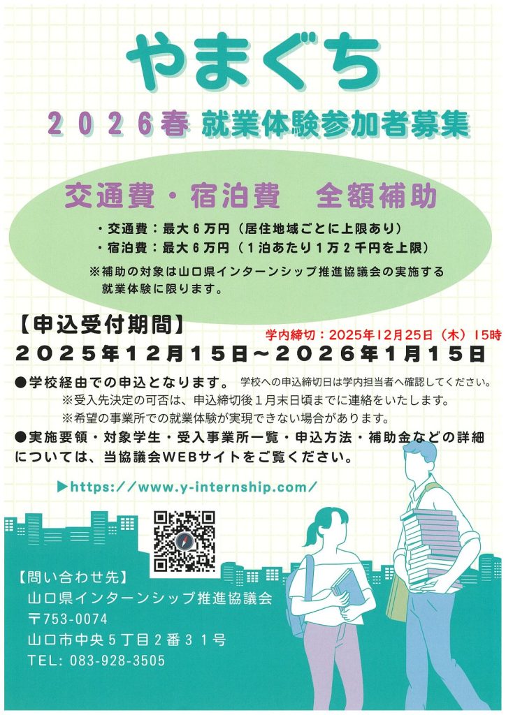 山口県インターンシップ推進協議会は、全国の学生を対象に、同県内の企業・官公庁で実施する春の就業体験(インターンシップ)の参加者を募集しています。