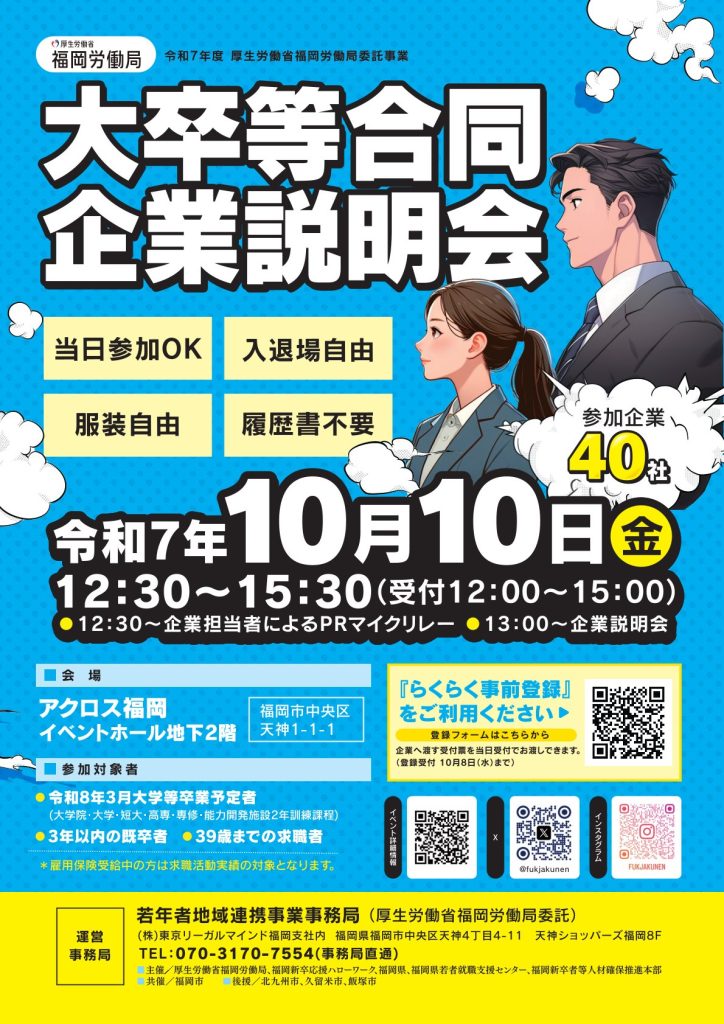 福岡労働局より、「大卒等合同企業説明会」のお知らせです。