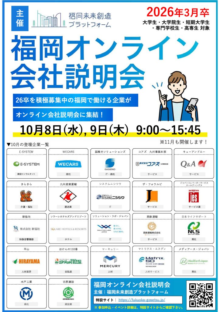 2026年3月卒業予定学生の新卒採用を、現在も積極的に行なっている、福岡都市圏の企業が、オンラインで登壇する会社説明会です。