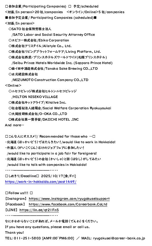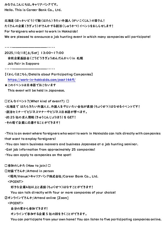 【留学生対象・FREE EVENT!】WORK in HOKKAIDO!『合同企業面談会in札幌』 10/18(SAT)13:00~17:00 対面(Attend in person)/オンライン(Attend online)Zoom 2025年09月22日 留学生