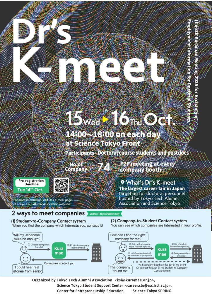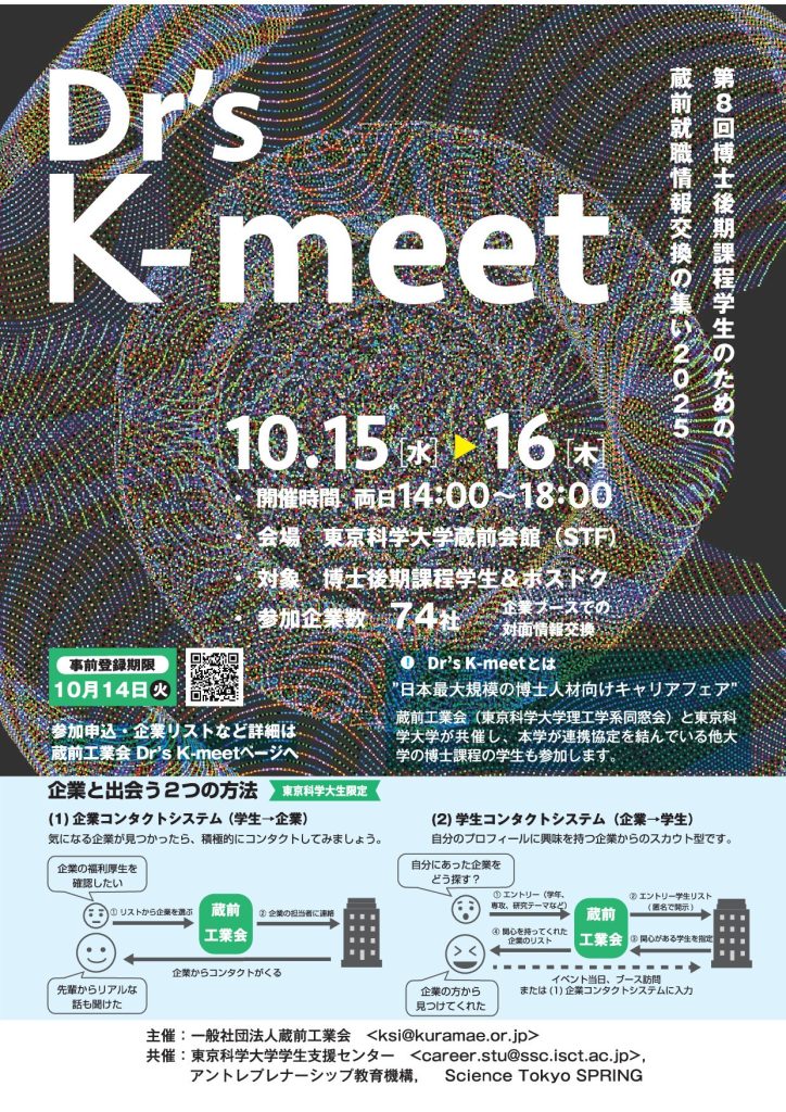 蔵前工業会(東京科学大学理工学系同窓会)では、「博士後期課程学生のための蔵前就職情報交換の集い(Dr’s K-meet)」を、10月15日(水)および16日(木)に、東京科学大学蔵前会館(大岡山キャンパス)において対面方式で開催いたします。