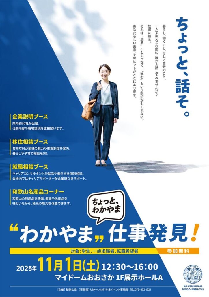 【事前予約制】”わかやま”仕事発見! 11月1日(土)12:30~16:00 大阪市中央区本町橋2番5号 (マイドームおおさか1F展示ホールA) 2025年09月24日 県主催・就職イベント 和歌山県では、学生及び一般求職者を対象に県内企業への就職を促進するため、和歌山県内企業30社が出展する合同企業説明会「”わかやま”仕事発見!」を開催します。詳細・申込は特設サイトでご確認ください。 特設サイトはこちら [日 時]2025年11月1日(土)12:30~16:00(受付12:00~)[会 場]マイドームおおさか 1F展示ホールA大阪市中央区本町橋2番5号