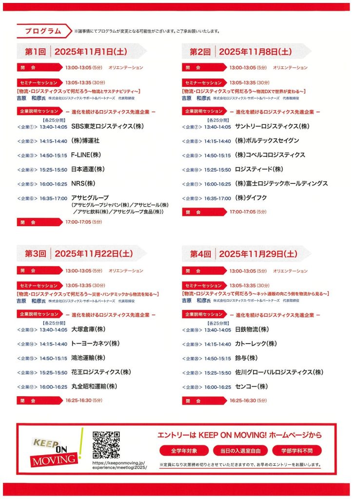 【学部学年不問】MEET LOGI!ONLINE(ロジスティクス・物流業界研究フォーラム) 11月1日・8日(土)13:00~17:05 / 11月22日・29日(土)13:00~16:30 オンライン(ZOOM) 2025年10月01日 業界研究・就職イベント ※クリックすると詳細ページへジャンプします※ 日本ロジスティクスシステム協会より、ロジスティクス・物流業界研究フォーラム『MEET LOGI!ONLINE』のご案内です。 ロジスティクス・物流の魅力とテクノロジーの活用動向と可能性、企業活動の情報を発信するイベントです。詳細・参加申込は詳細ページをご確認ください。 詳細ページはこちらから 【第1回】11月1日(土)【第2回】11月8日(土) ※各日とも13:00~17:05【第3回】11月22日(土)【第4回】11月29日(土)※各日とも13:00~16:30