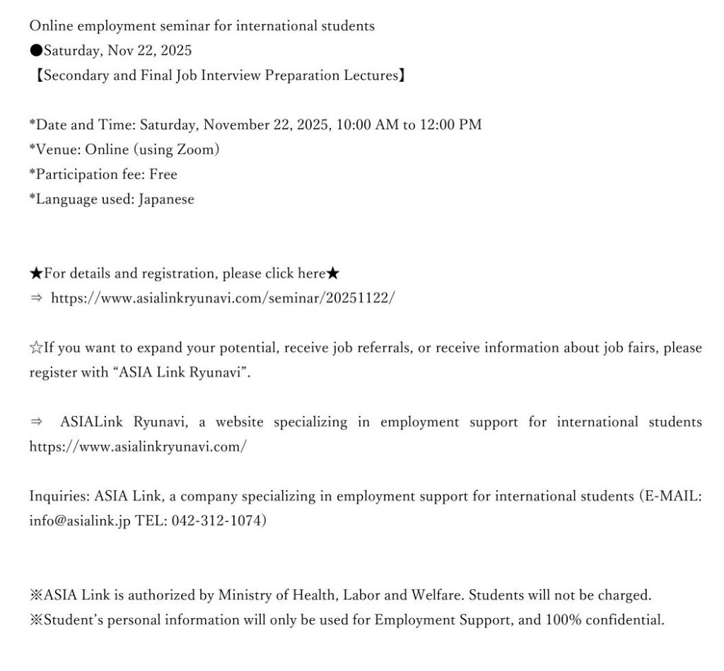 問合せ:留学生専門の就職支援会社ASIA Link (E-MAIL: info@asialink.jp TEL:042-312-1074)