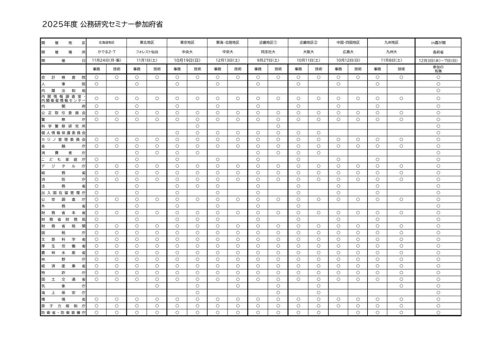 【事前予約制】〈人事院〉公務研究セミナー 詳細はホームページからご確認ください 2025年10月02日 公務員業界研究・就職イベント ※クリックすると詳細ページへジャンプします※ ※クリックすると参加府省一覧が確認できます※ 人事院より、2025年度公務研究セミナーのお知らせです。府省が一同に集まり本府省を中心に、業務内容・勤務実態・やりがいなどについて説明をします。事前予約制ですので、参加希望の方は、人事院のホームページより詳細を確認し、お申込みください。 人事院ホームページ