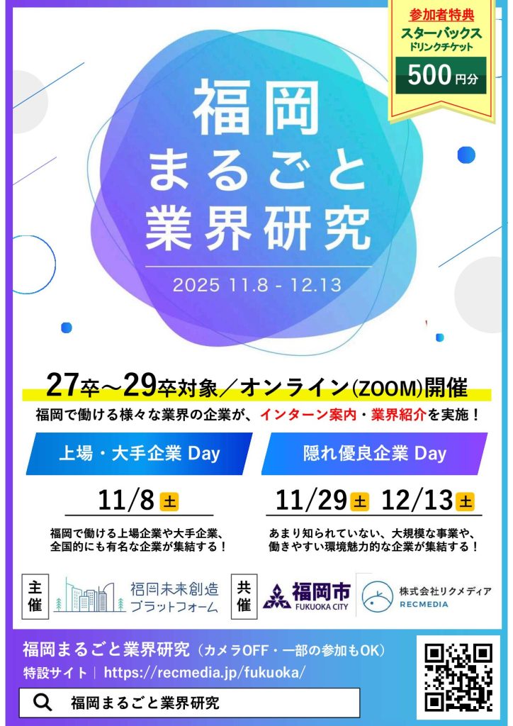 株式会社リクメディア様より、27・28・29卒予定者対象「福岡まるごと業界研究」のご案内です。