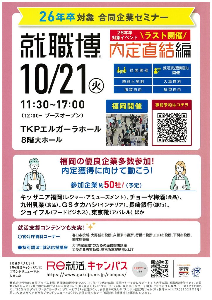 【26卒対象】〈福岡開催〉合同企業セミナー「就職博~内定直結編~」 10月21日(火)11:30~17:00 TKPエルガーラホール8階大ホール 〒810-0001 福岡県福岡市中央区天神1-4-2 2025年10月08日 業界研究・就職イベント26卒 ※クリックすると特設サイトへジャンプします※ Re就活キャンパスの就職博~内定直結編~のご案内です。延べ40社出展する全就活生を応援するイベントで、「事務職特集」、「教育・研修制度が充実している企業企業」、「福利厚生が自慢の企業特集」など業界を代表する会社が多数集結します! 詳細・参加を希望される方は特設サイトよりご確認ください。 特設サイト