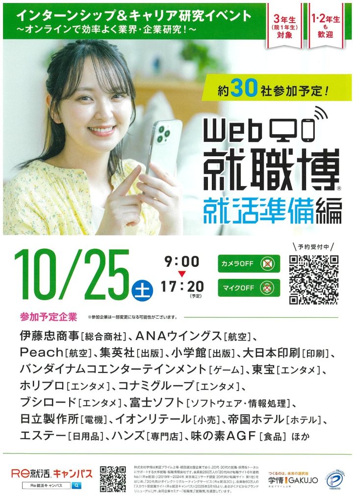 【27卒以降対象】〈オンライン〉合同企業セミナー「就職博~就活準備編~」 10月25日(土)9:00~17:20 オンライン 2025年10月08日 業界研究・就職イベント27卒28卒29卒 ※クリックすると特設サイトへジャンプします※ 27年卒以降を対象とした、合同企業セミナー「就職博~就活準備編~」のご案内です。詳細・参加希望の方は、特設サイトよりご確認ください。 特設サイト 【ここがポイント】★「業界を代表する企業」や「知っておきたい優良企業」が【インターンシップ情報】【業界・仕事のホンネトーク】をLIVE配信!★就活支援のプロによる「就活支援講座」も実施!★生放送なのでリアルタイムで匿名で質問できる!★視聴者側の映像や音声は放送されませんので、服装等も気にしなくてOK!★どこからでも視聴可能!
