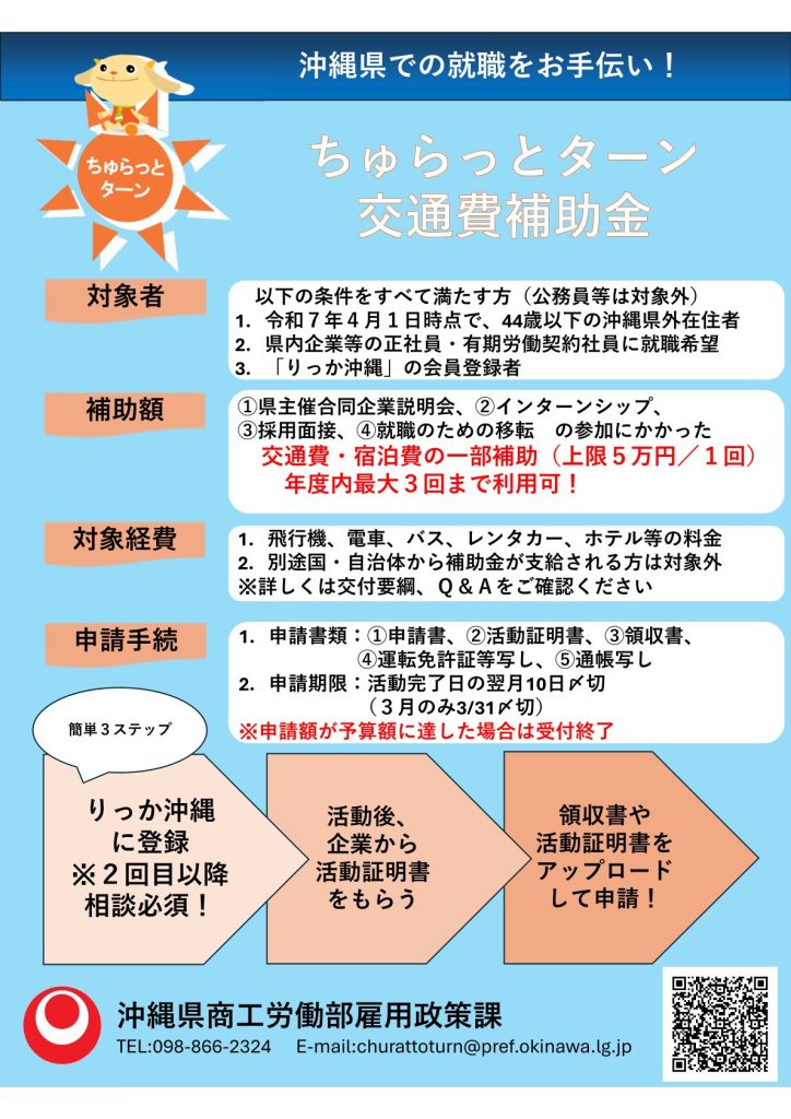 沖縄県への就職を支援するため、県外在住者の沖縄県内での就職活動にかかった交通費・宿泊費の一部(上限5万円)を最大3回補助します。