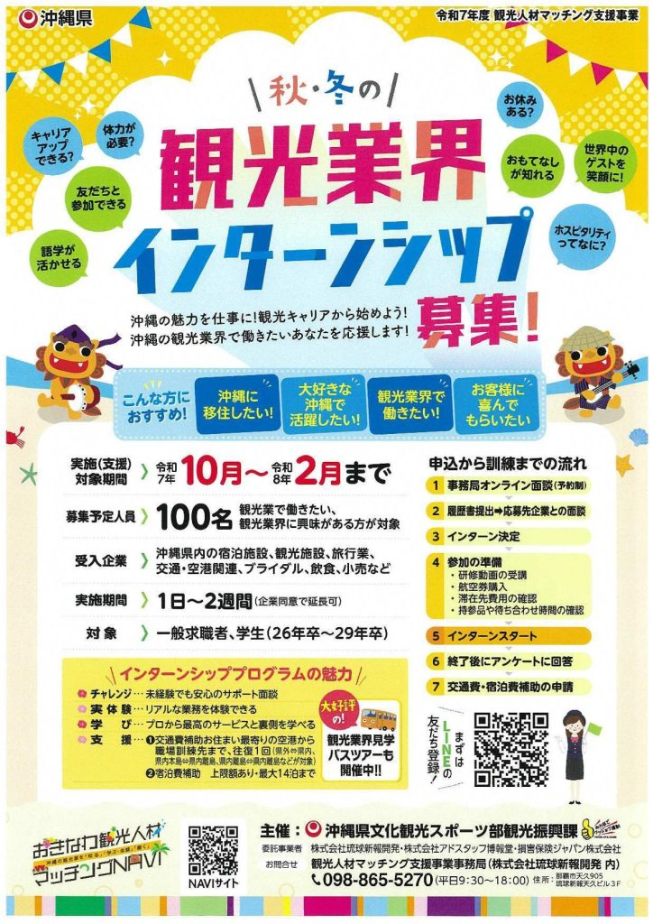 【学年不問・観光業界で働きたい人集合!】沖縄県・秋冬の観光業界インターンシップ 実施(支援)期間:2025.10月~2026.2月 2025年10月24日 県主催・就職イベントインターンシップ27卒26卒28卒29卒 ※画像をクリックすると拡大します※ 沖縄観光のお仕事を知りたい!体験したい!働きたい!という、あなたの気持ちを応援します。「おきなわ観光人材マッチングNAVI」では、観光業界で働きたい方、観光業界に興味のある方を対象に、事業者とのマッチングやインターンの実施を支援しております。対象企業や申込~実施までの流れなど、詳しくはおきなわ観光人材マッチングNAVIのページをご覧ください。 「おきなわ観光人材マッチングNAVI」についてはコチラ