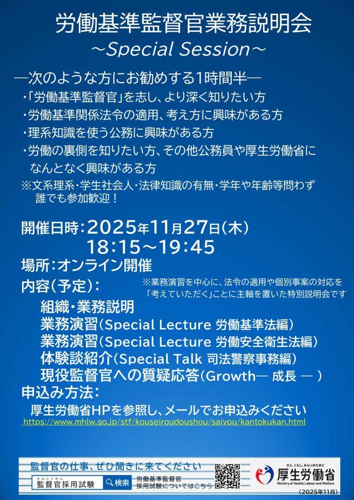 厚生労働省より、労働基準監督官についての特別説明会のご案内です。