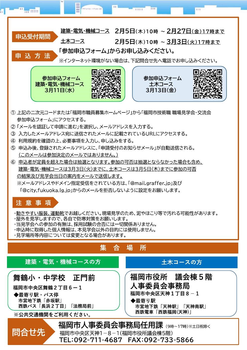 「建築・電気・機械コース」と「土木コース」に分かれています(事前申込制・各コース定員15名)。コース毎に申込フォームが異なりますので、上部ポスターまたは特設ページの注意事項をご確認の上、お申し込みください。