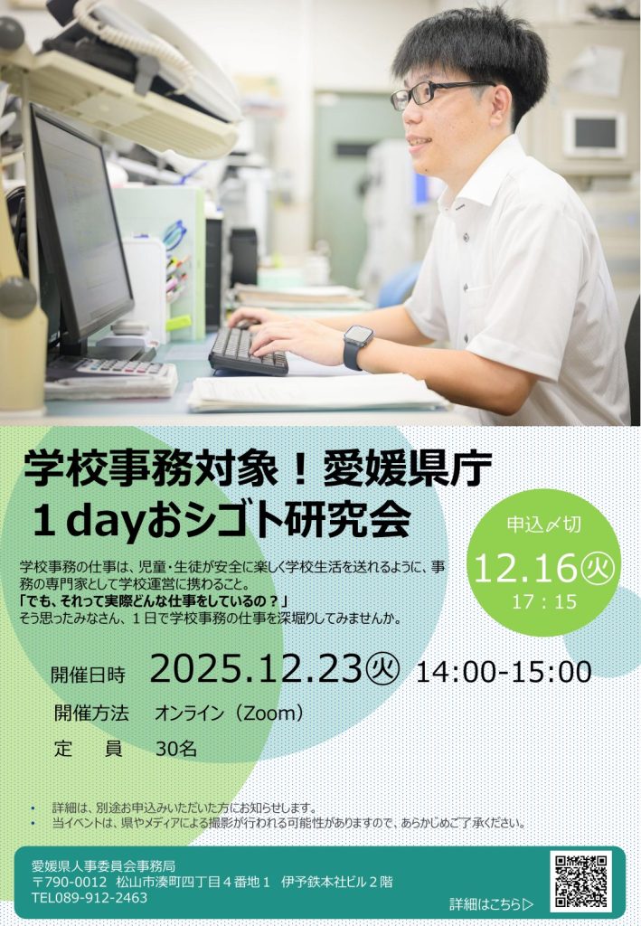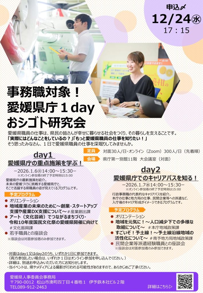 【要申込】愛媛県庁1dayおシゴト研究会 詳細ページをご確認ください 2025年12月02日 県主催・就職イベント Tweet Pocket ※クリックすると詳細ページへジャンプします※ ※クリックすると詳細ページへジャンプします※ 愛媛県は現在、1日完結型イベント「愛媛県庁1dayおシゴト研究会」の参加者募集を行っております。参加希望の方はイベントエントリーフォームより、登録後エントリーをお願いします。 イベントエントリーフォームはこちらから