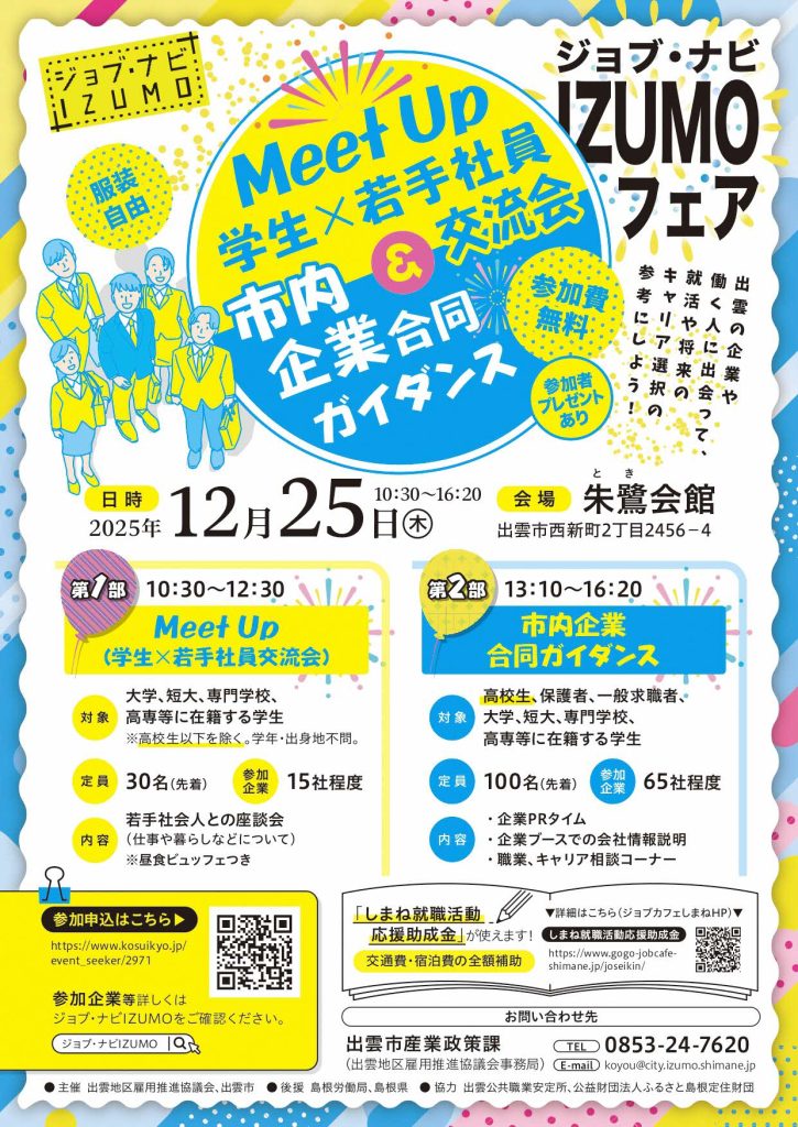 【先着順】「ジョブ・ナビIZUMOフェア」(交流会・市内企業合同ガイダンス) 12月25日(木)【第1部】10:30~12:30 【第2部】13:10~16:20 朱鷺会館(出雲市西新町2丁目2456-4) 2025年12月03日 業界研究・就職イベント Tweet Pocket ※クリックすると詳細ページへジャンプします※ 出雲市より、令和7年12月25日(木)に開催の、「ジョブ・ナビIZUMOフェア」のご案内です。 第1部は【出雲おしごとMeet Up(学生×若手社員交流会)】、第2部は【市内企業合同ガイダンス】の2部制のイベントです。参加希望の方は詳細ページからご確認・お申込みください。 詳細ページはこちらから