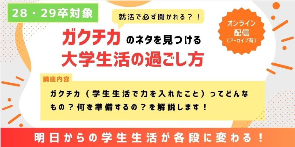 「ガクチカのネタを見つける!大学生活の過ごし方」と題した講座を実施いたします。