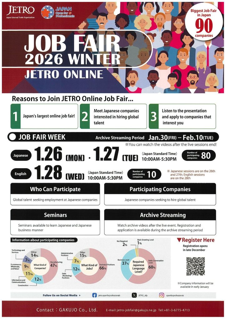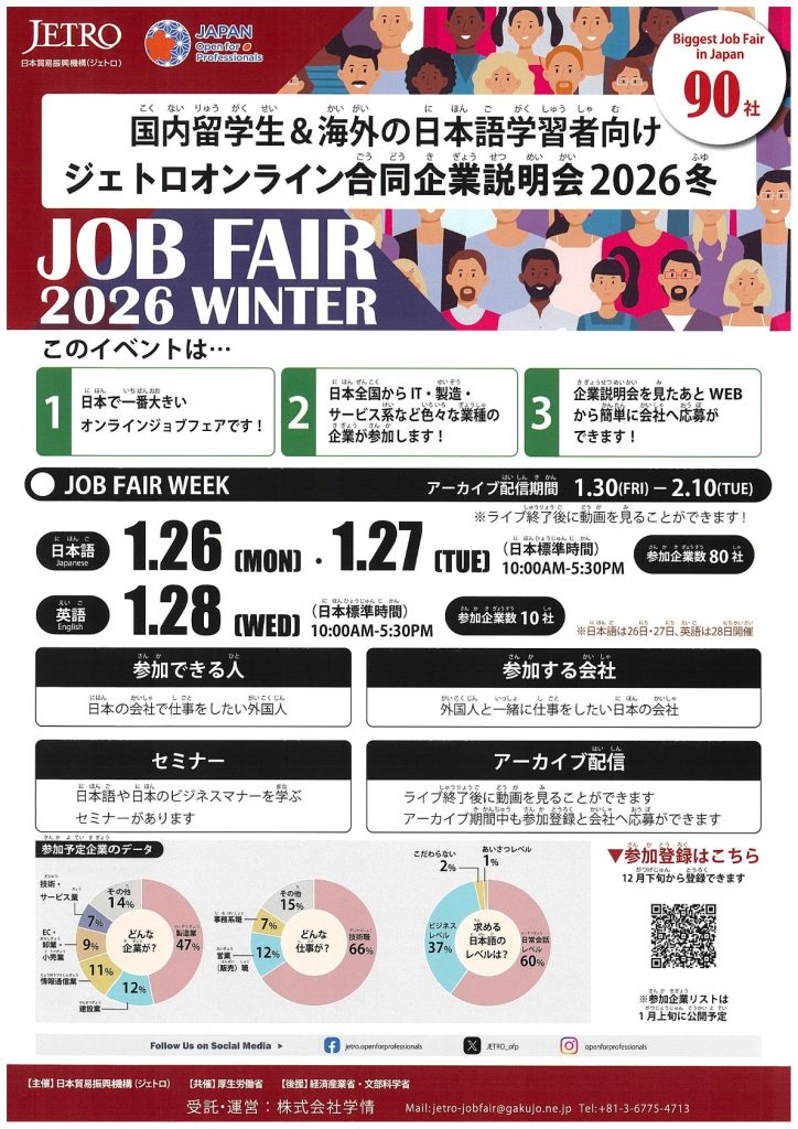 日本貿易振興機構(JETRO)より、合同企業説明会2026冬のご案内です。