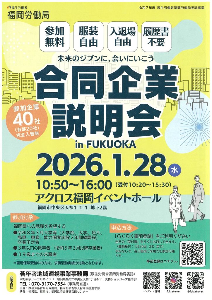 若年者地域連携事業事務局より、福岡開催の合同企業説明会のご案内です。