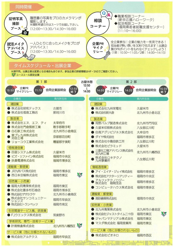 福岡県内に事業所を持つ企業40社が出展します。参加者が気になる企業を訪問するブース訪問形式で、採用担当者から直接会社説明、業務内容、職場環境、求人等の説明を聞くことができます。