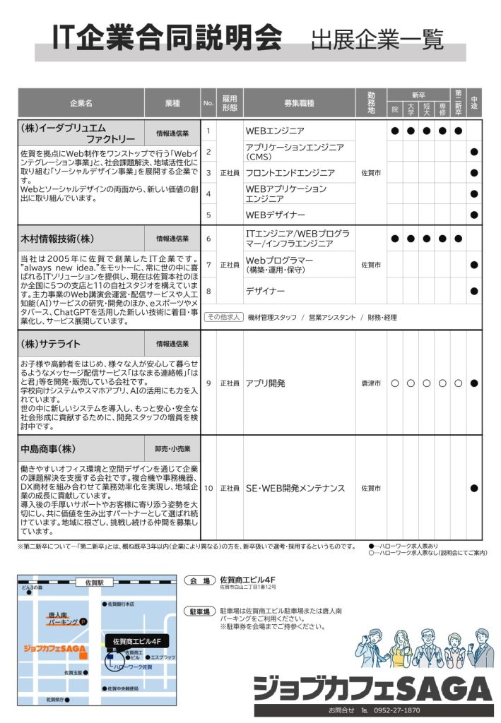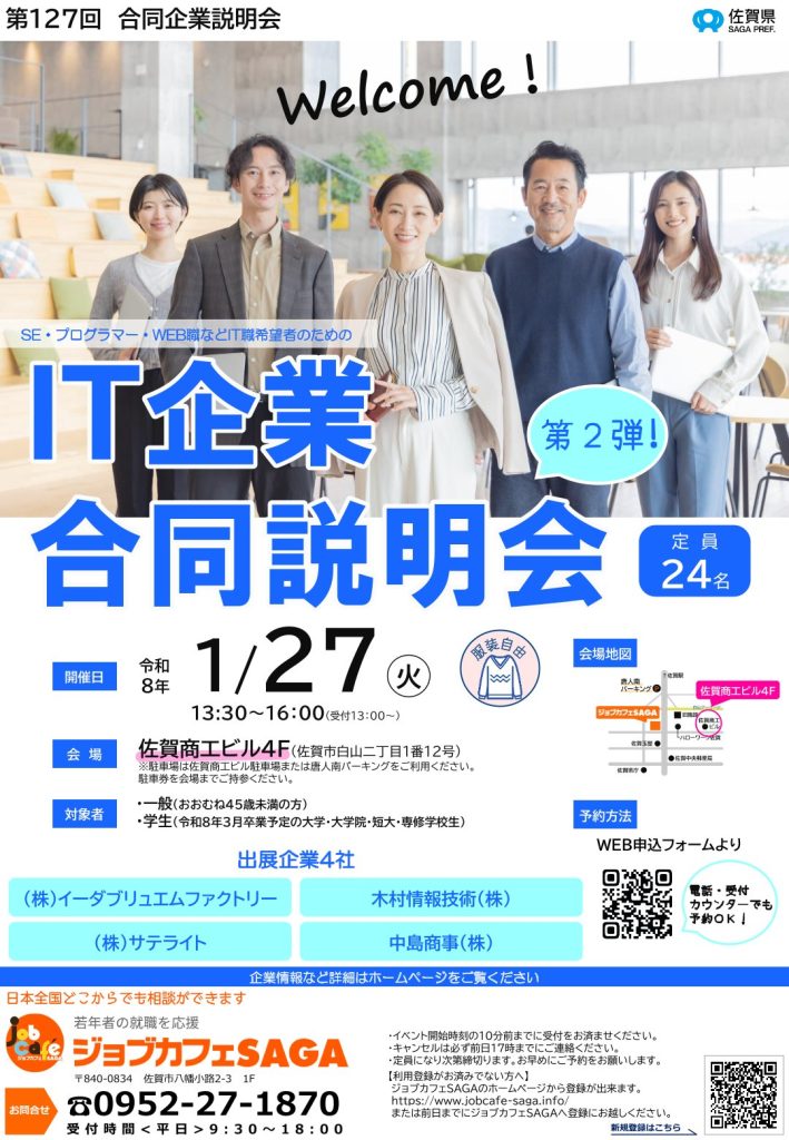 【27卒向け】〈佐賀〉IT企業合同説明会 令和8年1月27日(火)13:30~16:00 佐賀商工ビル4F 2025年12月25日 業界研究・就職イベント3年生 Tweet Pocket ※クリックすると特設サイトへジャンプします※ ※クリックすると拡大します※ ジョブカフェSAGAより、IT企業合同説明会のご案内です。 佐賀県内の優良IT関連企業4社が一同に集結!オフィスワーク系の仕事を探している方、IT業界や仕事内容についてもっと知りたい方は必見です。 1/27(火)「IT企業合同説明会」・対象は学生・一般・県内の優良IT関連企業が4社出展予定・IT企業に限定せずITにかかわる職種で求人している企業も参加 特設サイトはこちらから