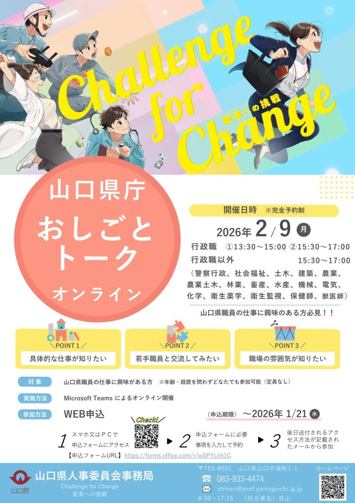 山口県より、「山口県庁おしごとトークオンライン」のご案内です。