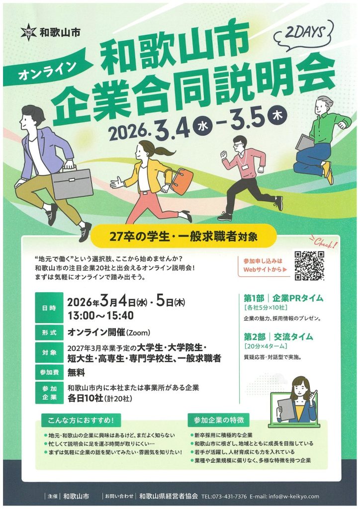 【27卒向け】オンライン和歌山企業合同説明会 2026年3月4日(水)・5日(木) 13:00~15:40 オンライン開催(Zoom) 2026年02月04日 業界研究・就職イベント3年生院1年 Tweet Pocket ※クリックすると詳細ページへジャンプします※ 和歌山市主催の企業合同説明会のご案内です。 “地元で働く”という選択肢、ここから始めませんか?和歌山市の注目企業20社と出会えるオンライン説明会!まずは気軽にオンラインで踏み出そう。 【日時】2026年3月4日(水)・5日(木) 13:00~15:40【形式】オンライン開催(Zoom)【対象】2027年3月卒業予定の大学生・大学院生・短大生・高専生・専門学校生、一般求職者【参加費】無料【参加企業】和歌山市内に本社または事業所がある企業、各日10社(計20社) 詳細ページ(申込)はこちらから
