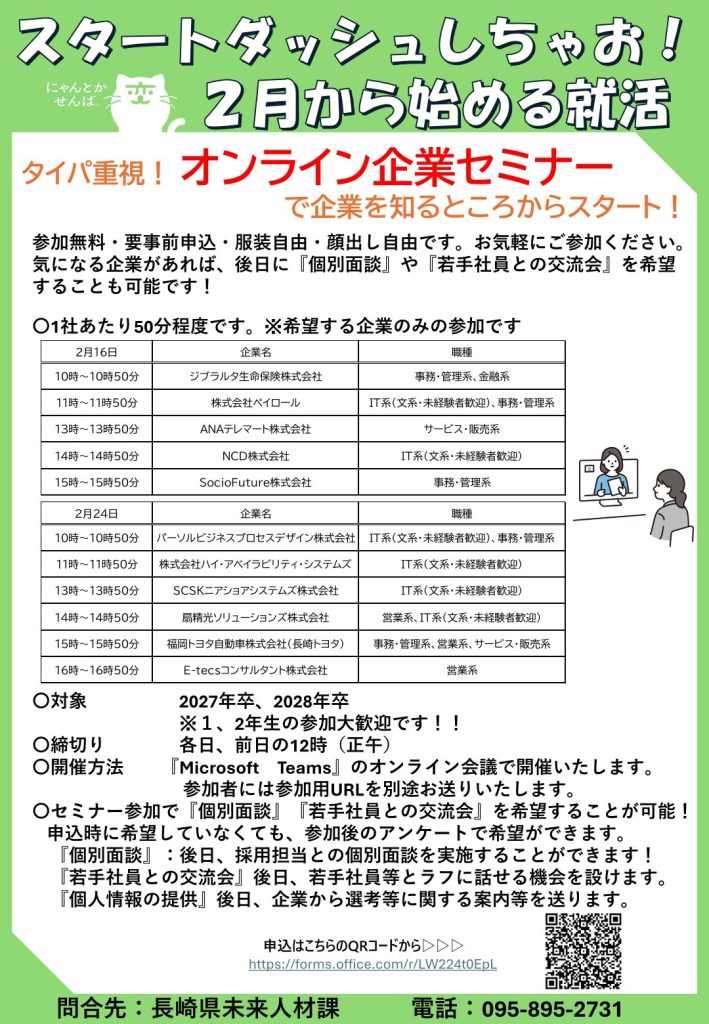【27卒以降対象】長崎県主催「オンライン企業セミナー」 ①2/16(月)10:00~15:50 ②2/24(火)10:00~16:50 オンライン(Teams) 2026年01月15日 県主催・就職イベント3年生2年生1年生 Tweet Pocket ※クリックすると拡大します※ 長崎県より、オンライン企業セミナー(27・28・29卒向け)のご案内です。 参加無料・服装、顔出し自由のオンライン企業セミナーです。お気軽にご参加ください。気になる企業があれば、後日「個別面談」や「若手社員との交流会」を希望することが可能です。 【日時】①2/16(月)10:00~15:50②2/24(火)10:00~16:50【申込締切】開催日の前日正午まで 申込フォームはこちら