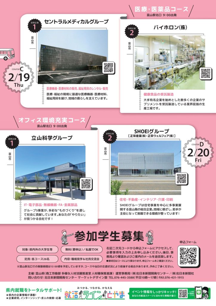 2月13日(金)~2月20日(金)のうち計4日間、県内企業を半日で2社巡る「TOYAMA就活バスツアー」を実施いたします!