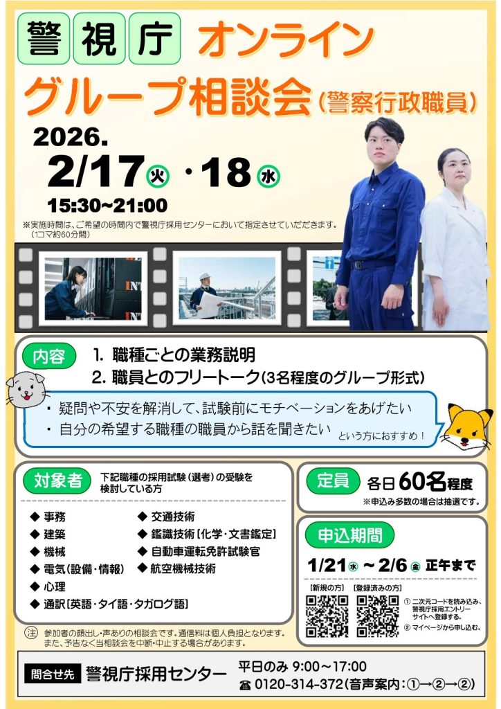 この度、警視庁警察官・警察行政職員に興味を持つ方を対象に、「警視庁オンライングループ相談会」を開催いたします。