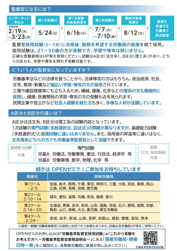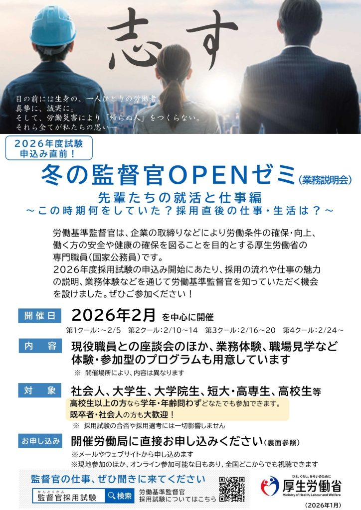 厚生労働省より、労働基準監督官OPENゼミのご案内です。