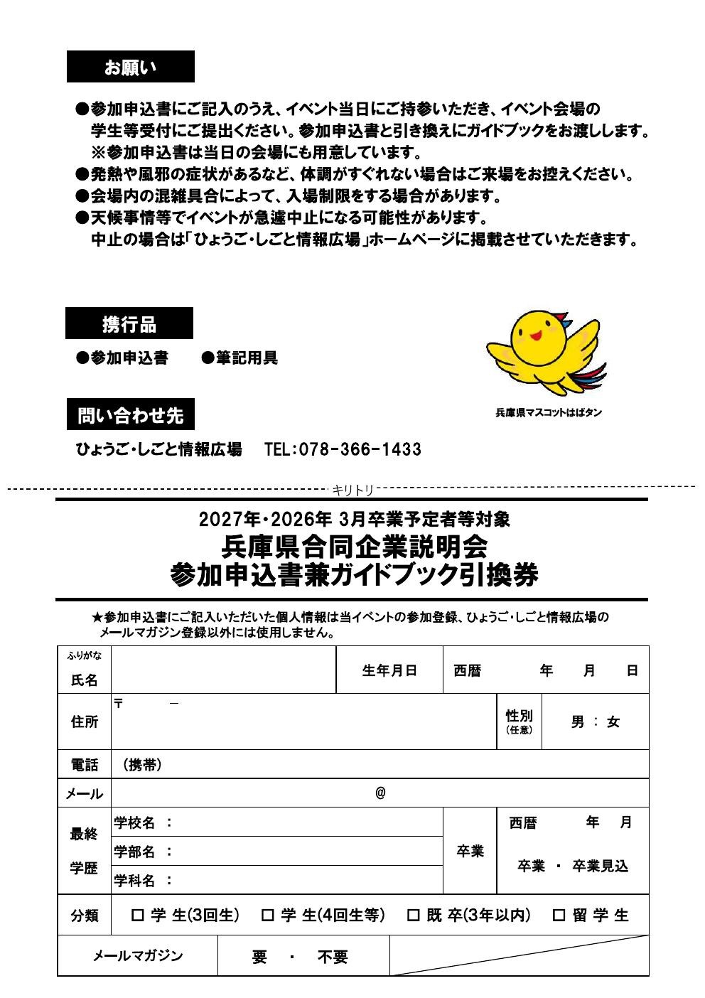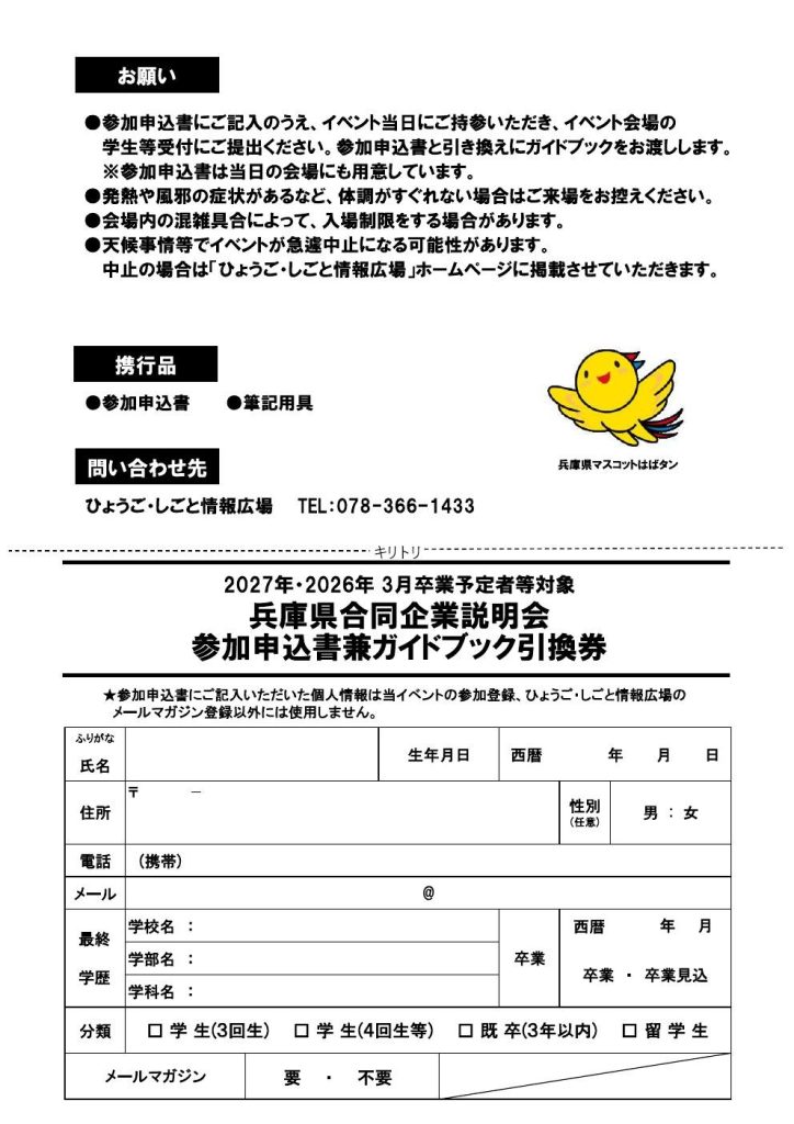 【対面型・事前申込要りません】兵庫県合同企業説明会 3/12(木)13(金) 13:00~16:30 神戸クリスタルタワー3F クリスタルホール 2026年02月10日 自治体主催・就職イベント4年生3年生院1年 Tweet Pocket ※各画像をクリックすると拡大します※ 兵庫県は、3月に合同企業説明会を開催します。主に27卒・26卒予定者を対象にした、企業説明会になります。参加費無料。事前の参加申込も不要です。また、28・29卒予定の方の参加も歓迎!※28・29卒の方については、企業・インターンシップに関する説明のみになります当日は「参加申込書」をご持参の上、会場にお越しください。