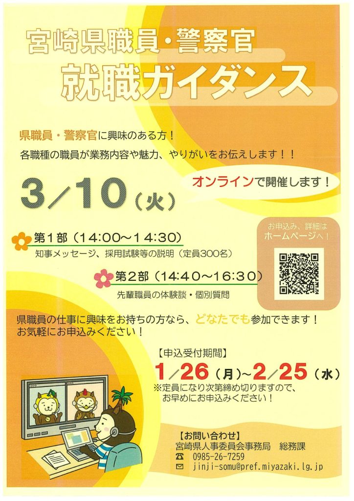 宮崎県より、宮崎県職員・警察官就職ガイダンスのご案内です。