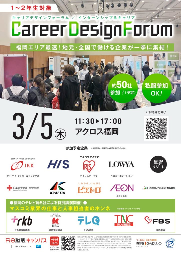 【1・2年生対象】Re就活キャンパス「Career Design Forum」 3/5(木) 11:30~17:00 アクロス福岡 地下2階 イベントホール 2026年02月04日 就活サイト2年生1年生 Tweet Pocket ※クリックすると詳細ページにジャンプします※ Re就活キャンパスより、1・2年生対象のキャリアデザインフォーラムのご案内です。参加希望の方は特設サイトより詳細をご確認ください。 日時:3/5(木) 11:30~17:00(11:00~受付開始、11:30~オープニング講演、12:00~企業ブース開始)会場 :アクロス福岡 地下2階 イベントホール