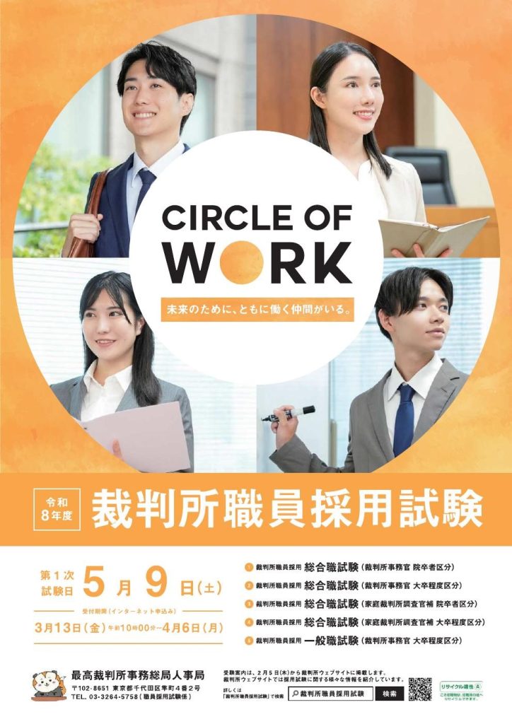 総合職試験及び一般職試験(裁判所事務官、大卒程度区分)の受験案内は令和8年2月5日(木)から、一般職試験(裁判所事務官、高卒者区分)の受験案内は令和8年5月下旬に、裁判所ウェブサイトの「受験案内」に掲載する予定です。