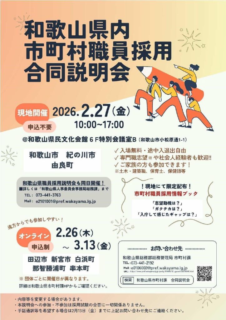 参加する自治体や、説明会の詳細については、県市町村課のホームページをご覧ください。(「和歌山県市町村課 合同説明会」で検索すると上位に表示されます)