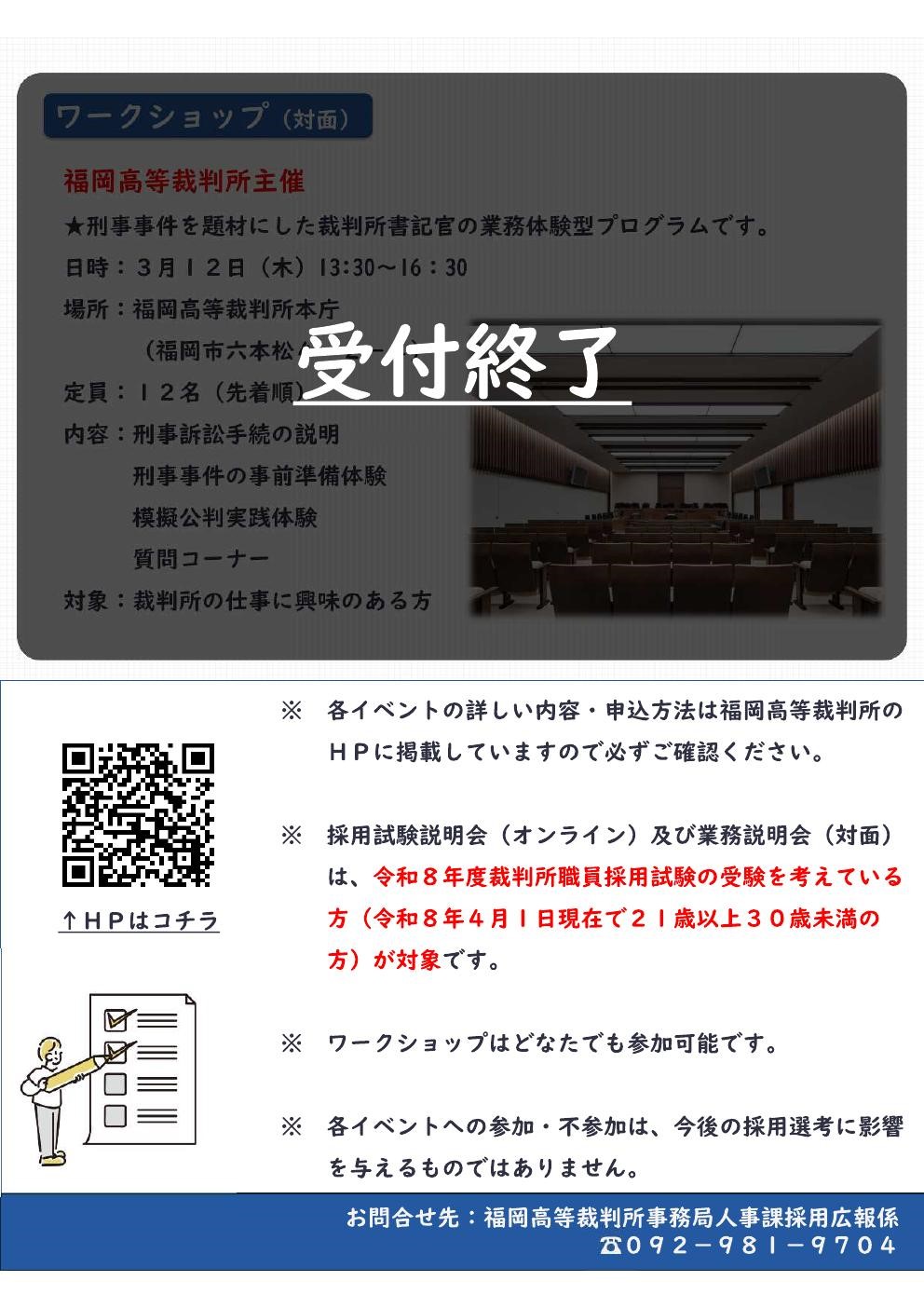 福岡高等裁判所管内において、オンライン採用試験説明会や、管内の裁判所で対面の業務説明会、福岡高等裁判所で書記官業務のワークショップを実施します。