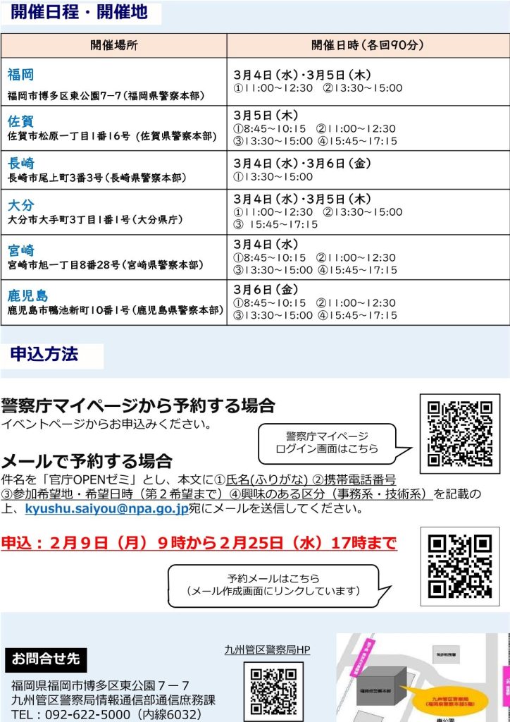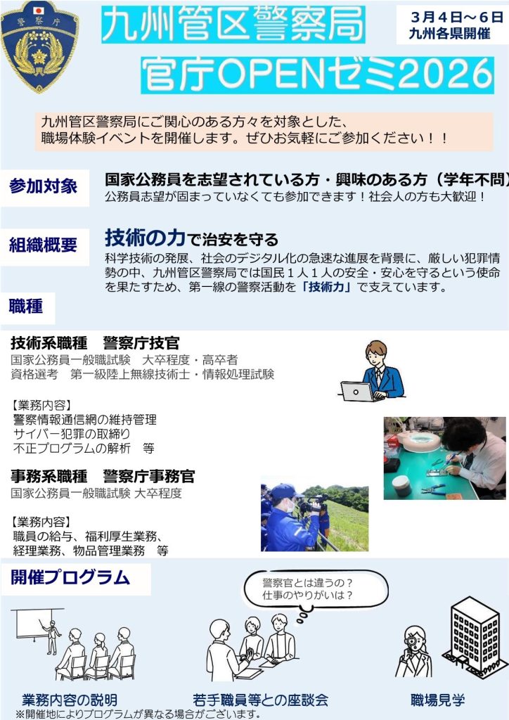 【長崎は3/4・3/6開催】九州管区警察局 官庁OPENゼミ2026(申込〆切:2/25) 《九州各県で開催・スケジュールはポスターで確認ください。》 2026年02月10日 公務員4年生3年生2年生1年生院1年 Tweet Pocket ※各画像をクリックすると拡大します※ 九州管区警察局では、国家公務員を志望されている方や、九州管区警察局に関心をお持ちの方を対象とした職場体験イベントを、3月4日~6日に九州各県で開催します。長崎県情報通信部においては、3/4・3/6に実施予定となっています。学年学部不問・公務員志望が固まってなくても参加可能です。ぜひお気軽にご参加ください。参加申込はすべて、上部ポスター記載のQRコードからお願いいたします。《申込〆切:2/25 17:00迄》